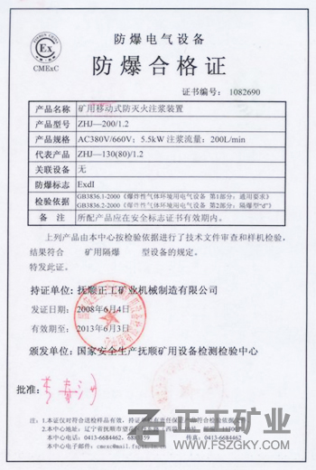 防爆合格证-矿用移动式防灭火注浆装置ZHJ-200/1.2