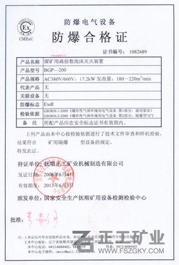 防爆合格证-煤矿用高倍数泡沫灭火装置BGP-200