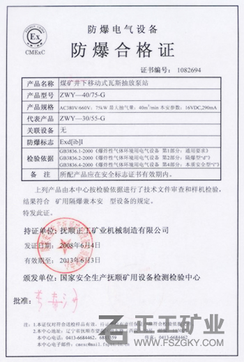 防爆合格证-煤矿井下移动式瓦斯抽放泵站ZWY-40/75-G